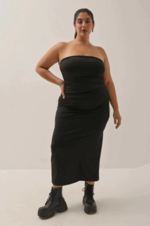 Vestido midi strapless con frunce en ambos extremos. Es una prenda que aporta elegancia, glamour y un toque de sensualidad. Con su tonalidad negro que nunca pasa de moda y es nuestro fiel caballito de batallas,